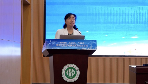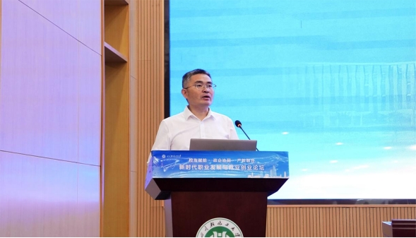学校党委副书记陈范华在致辞中强调,学校始终坚持“厚德达理、励志勤工”校训,弘扬“652精神”,主动对接国家战略和区域发展需求,持续深化产教融合与科教融汇,构建“教育链—人才链—产业链”协同育人体系。本次论坛是学校推进“校地企三方协同”的重要实践,通过汇聚校友智慧、整合政企资源,为学生成长成才搭建更广阔的平台,为区域经济高质量发展注入新动能。