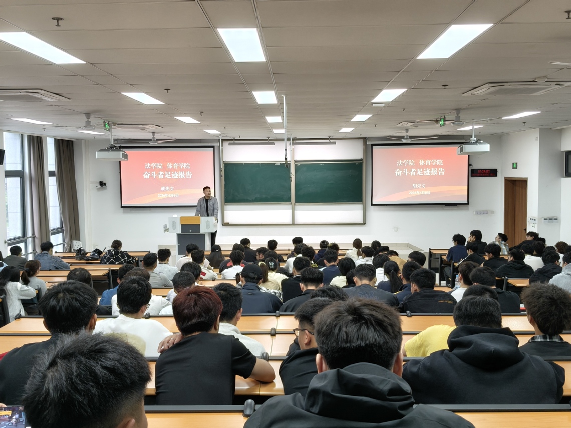 4 月 8 日下午,法学院与体育学院联合举办 “奋斗者足迹” 专题报告会,特邀我校2013级行政管理专业校友、青年创业者胡先文返校分享创业历程。法学院校友会秘书长童静主持会议,两院百余师生到场聆听。